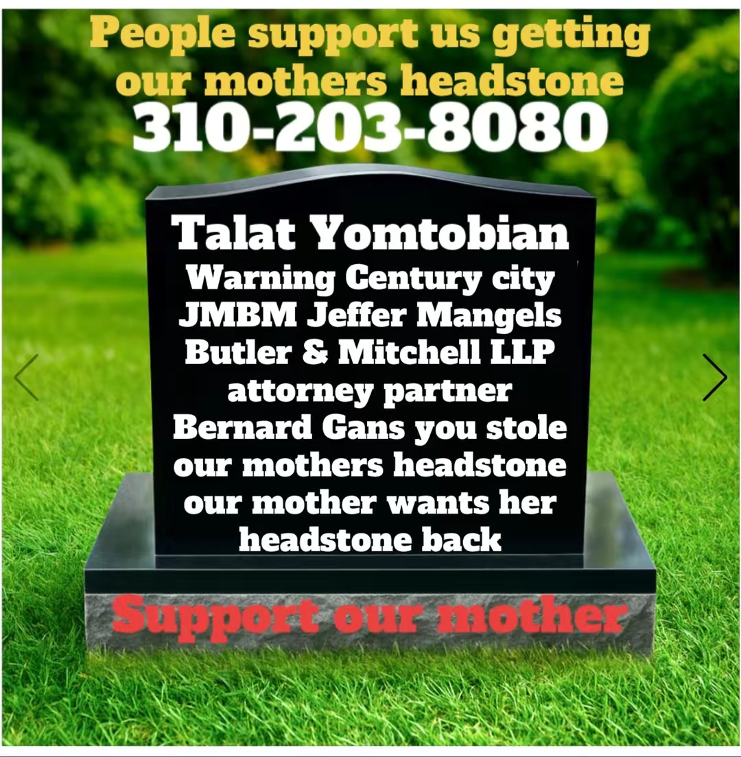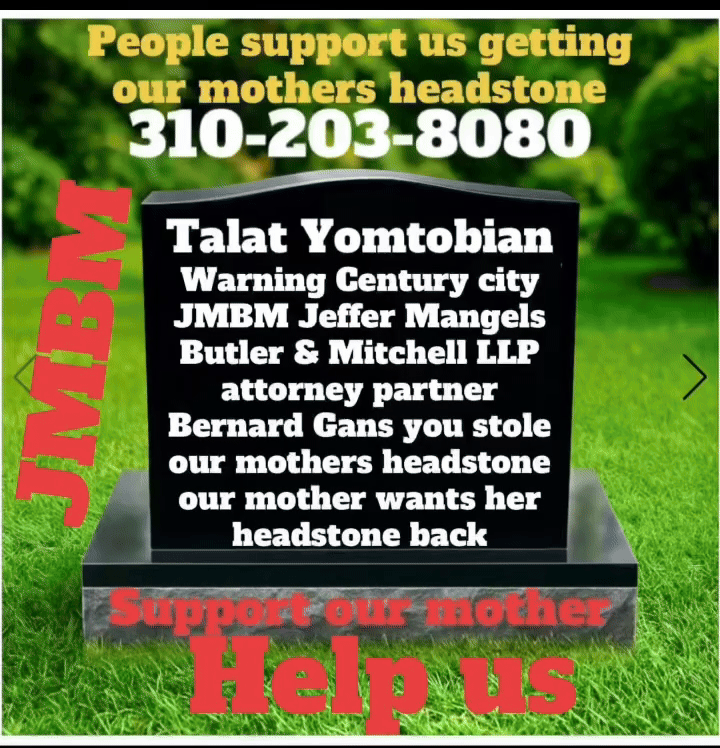 Century City Police 90067 Department JMBM attorney Thief Bernard R. Gans Jeffer Mangels Butler & Mitchel LLP JMBM attorney thief you have 24 hours to place the headstone or we are going to Century City Police department to report your crimes